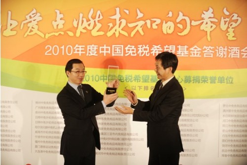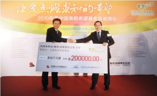 中國青少年發(fā)展基會(huì)秘書長涂猛先生致辭。中國免稅品(集團(tuán))有限責(zé)任公司副總裁陳國強(qiáng)先生代表中國免稅希望基金致了答謝詞。中免集團(tuán)全體領(lǐng)導(dǎo)上臺,向 “2010年度中國免稅希望基金愛心募捐榮譽(yù)單位”頒發(fā)獎(jiǎng)牌。隨后,為了表彰中免集團(tuán)發(fā)起并成立僅僅三年的“中國免稅希望基金”為中國公益事業(yè)做出的突出 貢獻(xiàn),中國青少年發(fā)展基金會(huì)把特別設(shè)立的“希望工程20年杰出公益伙伴”獎(jiǎng)?lì)C發(fā)給中免集團(tuán)。