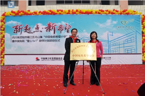 2010年10月11日上午,位于四川省資陽(yáng)市雁江區(qū)丹山鎮(zhèn)牌坊村的中國(guó)免稅希望小學(xué)里喜氣洋洋、熱鬧非凡。特意從北京趕來(lái)的中國(guó)青少年發(fā)展基金會(huì)的汪 敏副秘書(shū)長(zhǎng)、馮敏慧部長(zhǎng),中免集團(tuán)盧路總裁和四川省市兩地的領(lǐng)導(dǎo)與全校近兩百名師生一起為新落成的“資陽(yáng)市雁江區(qū)丹山鎮(zhèn)中國(guó)免稅希望小學(xué)”舉行了隆重的落 成典禮。