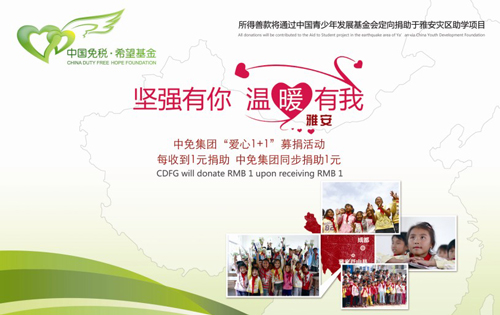 在四川雅安地震發(fā)生后,中免集團與中國青少年發(fā)展基金會(以下簡稱“青基會”)緊急協(xié)商籌備,決定通過“中國免稅希望基金”,在中免集團全體員工、各下屬門店以及門店消費者中發(fā)起主題為“愛心1+1”的募捐活動。 “愛心1+1”即中免集團將對消費者所捐善款按1:1進行配比,最終通過青基會用于雅安震后教育設(shè)施恢復(fù)和兒童復(fù)學(xué)項目,同時中免集團也將通過官網(wǎng)與官方微博第一時間公布善款使用情況,所有捐款接受專項審計?;顒訉⒊掷m(xù)至5月20日,在此期間,公眾可在中免集團三亞免稅店以及各邊境、機場免稅店參與本次愛心捐助活動。