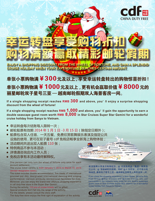 圣誕元旦臨近,旅游價格相對平穩(wěn)、上班族集中休假等因素使得今年雙節(jié)旅游市場再次迎來出游小高峰。其中不少公司白領將春節(jié)出境游計劃提前,選擇性價比更高的錯峰出游。各大商家的年終促銷活動讓節(jié)日提前升溫,2013年12月15日-2014年1月5日期間,中國免稅品(集團)有限責任公司(以下簡稱中免集團)旗下十家免稅店聯(lián)合推出“幸運轉(zhuǎn)出來&幸運秀出來”年終主題促銷活動,貼心的購物折扣以及價值約百萬元的麗星郵輪船票大獎,為雙節(jié)出境游客送上別樣驚喜。