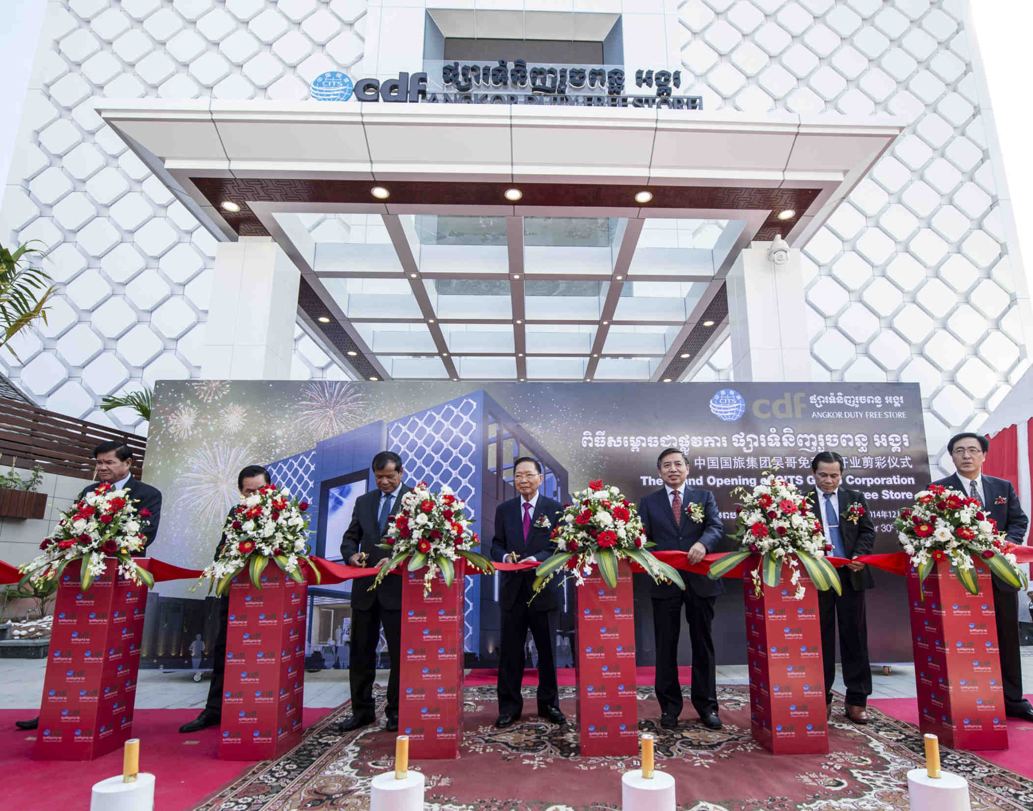 2014年12月30日,備受矚目的中國國旅集團吳哥免稅店在柬埔寨王國暹粒市隆重開業(yè)。柬埔寨王國副首相吉春閣下、旅游部部長唐坤閣下、暹粒省市各級主要官員,國旅集團董事長、總經(jīng)理王為民,國旅股份公司副總裁彭輝,總會計師閆建平,副總裁于寧寧,總裁助理陳志新,以及國際供應(yīng)商代表、合作伙伴代表等近200人參加了開業(yè)慶典活動。