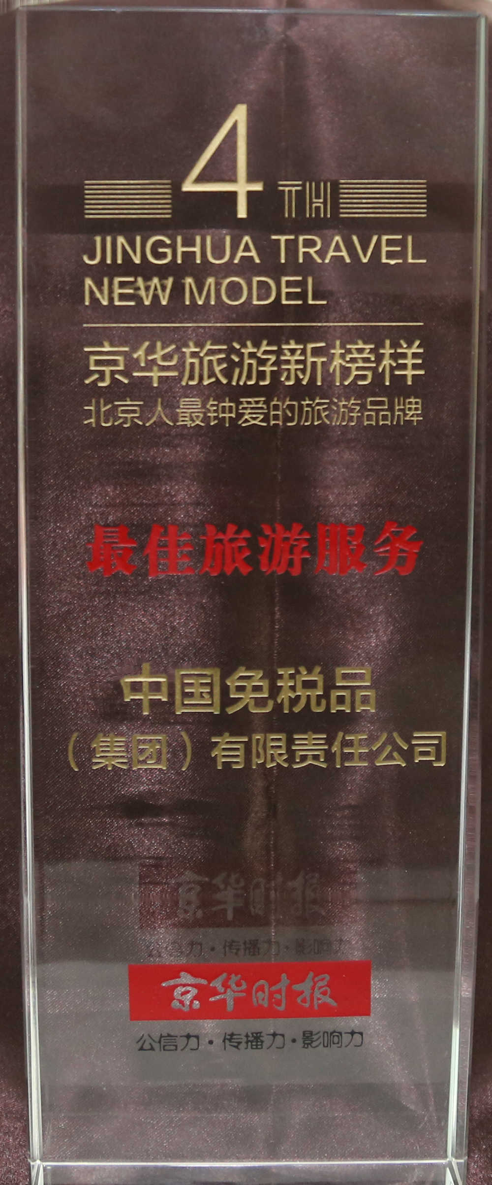 2015年3月13日,由京華時(shí)報(bào)社主辦,京華旅游周刊、京華網(wǎng)承辦的“第四屆京華旅游新榜樣——北京人最鐘愛(ài)的旅游品牌”頒獎(jiǎng)盛典在京舉辦,中免集團(tuán)榮獲年度最佳旅游服務(wù)獎(jiǎng)。