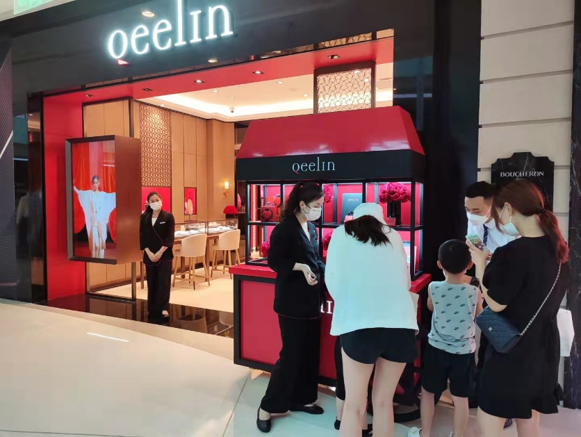 在QEELIN店前也出現(xiàn)以紅黑撞色為主色調(diào)的互動(dòng)裝置,吸引不少消費(fèi)者前來(lái)參與打卡?!斑@個(gè)品牌的項(xiàng)鏈我很喜歡,這次來(lái)發(fā)現(xiàn)參與互動(dòng)打卡還可以領(lǐng)小禮品,可以選擇的東西還挺多,我最喜歡那個(gè)小巧的包包?!眮?lái)自廣西的陳女士指著展示臺(tái)上的禮品說(shuō)到。據(jù)了解,QEELIN此次活動(dòng)禮品選取了多款式飲品、IP小熊貼紙和帶有品牌logo的裝飾包包,顧客只需拍照打卡分享至社交平臺(tái)即可領(lǐng)取心儀禮品。