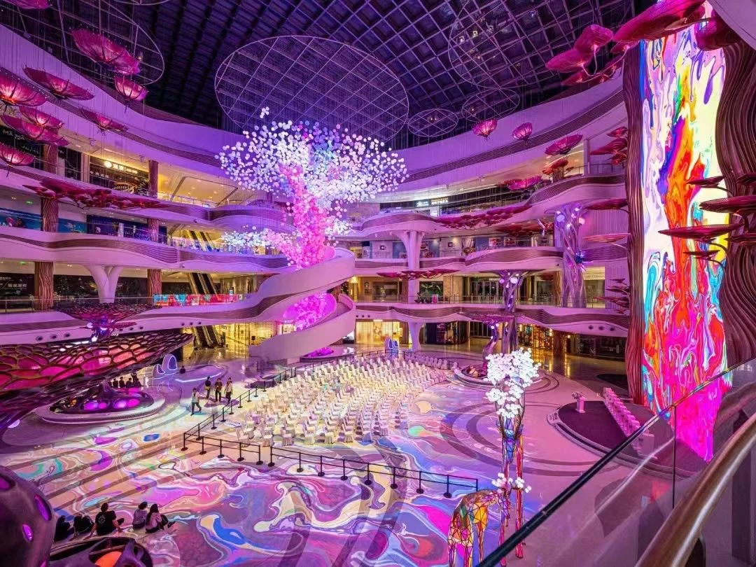 ▲海口國(guó)際免稅城項(xiàng)目“AURA天際秘林”中庭(攝于調(diào)試階段)