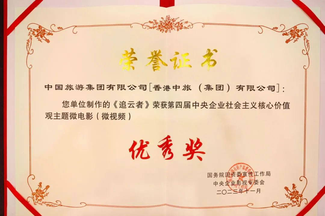 近日,在國(guó)務(wù)院國(guó)資委宣傳工作局主辦的2023年中央企業(yè)社會(huì)主義核心價(jià)值觀主題微電影(微視頻)展映征集活動(dòng)上,中免投資發(fā)展有限公司(中國(guó)旅游集團(tuán)中免股份有限公司全資子公司)制作的《追云者》代表中國(guó)旅游集團(tuán)從500余部參評(píng)作品中脫穎而出,榮獲“第四屆中央企業(yè)社會(huì)主義核心價(jià)值觀主題微電影(微視頻)”優(yōu)秀獎(jiǎng)(敬業(yè)奉獻(xiàn)類)。
