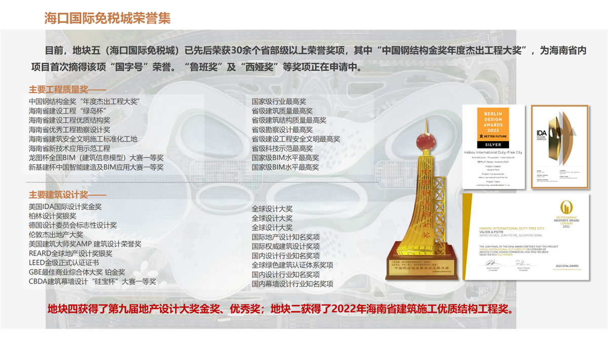 ▲ ??趪?guó)際免稅城項(xiàng)目整體建設(shè)所獲榮譽(yù)