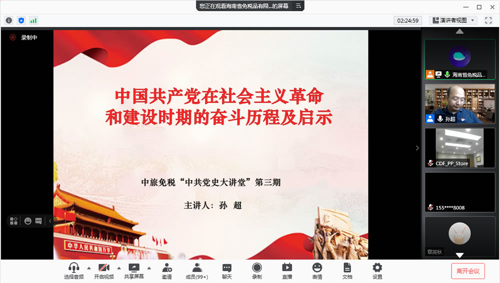 2021年5月27日,中旅免稅黨委舉辦第三期“黨史大講堂”專題培訓(xùn)。根據(jù)中旅免稅黨委“黨史大講堂”培訓(xùn)工作安排,此次活動(dòng)由海南省免稅品有限公司黨委組織承辦,海南省免稅品有限公司黨委班子成員和機(jī)關(guān)黨支部全體黨員在會(huì)議室集中參加線上培訓(xùn),中旅免稅其他各級(jí)黨組織黨員和入黨積極分子共600余人通過視頻方式線上參會(huì)。