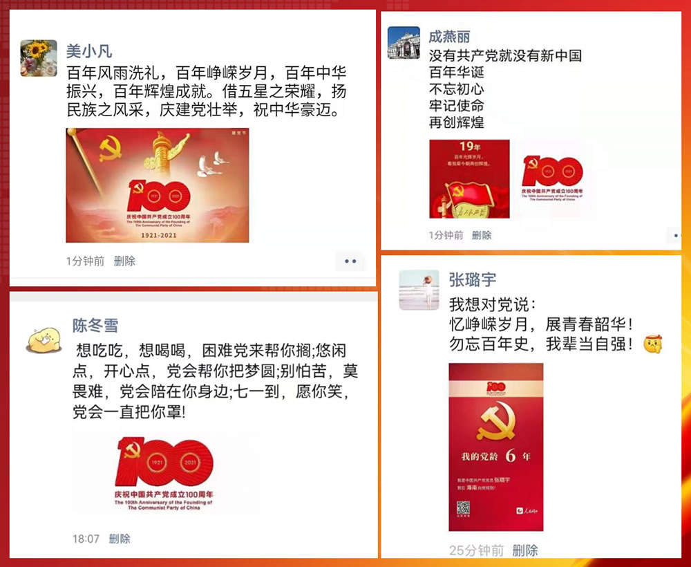 奮斗百年路,啟航新征程。為慶祝黨的百年華誕,激發(fā)黨員群眾愛黨愛國熱情,近日來,公司各級(jí)黨組織、團(tuán)組織積極組織黨員和團(tuán)員青年開展了形式多樣的主題活動(dòng),表達(dá)對(duì)中國共產(chǎn)黨的無限熱愛和對(duì)祖國的美好祝福!