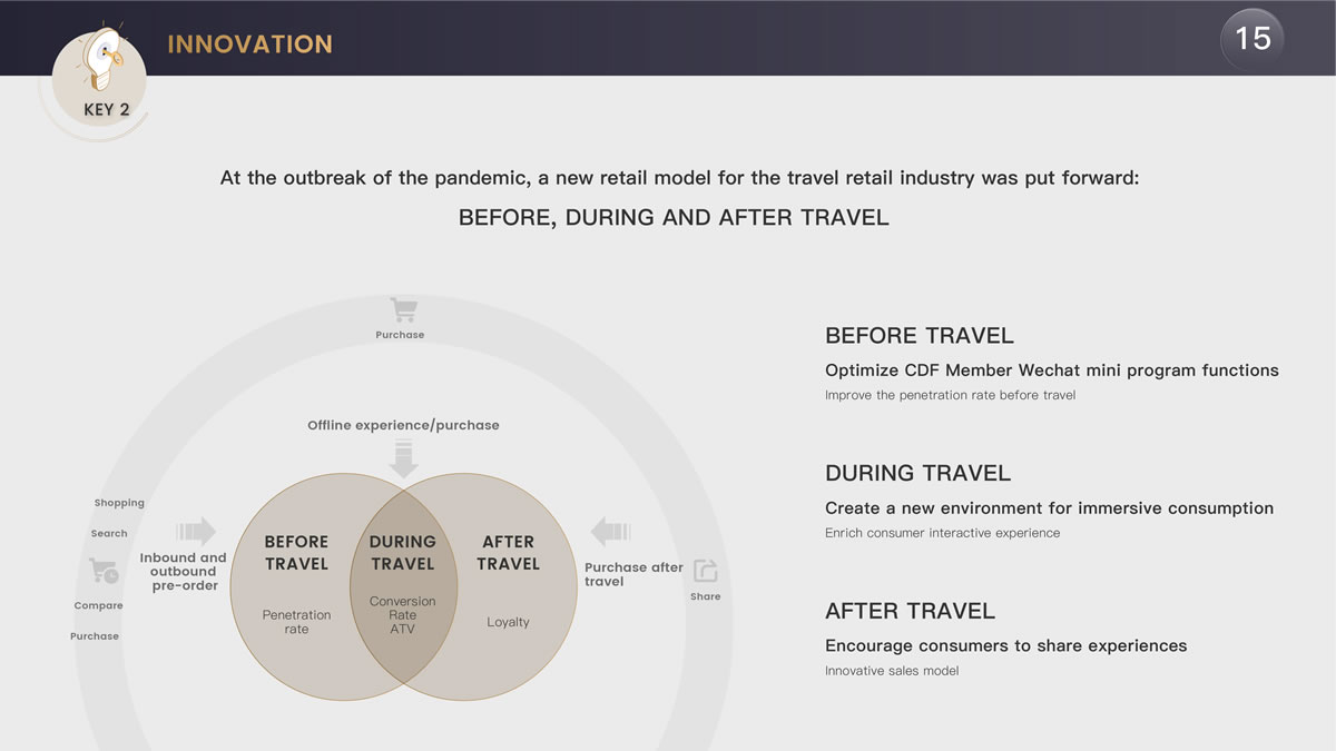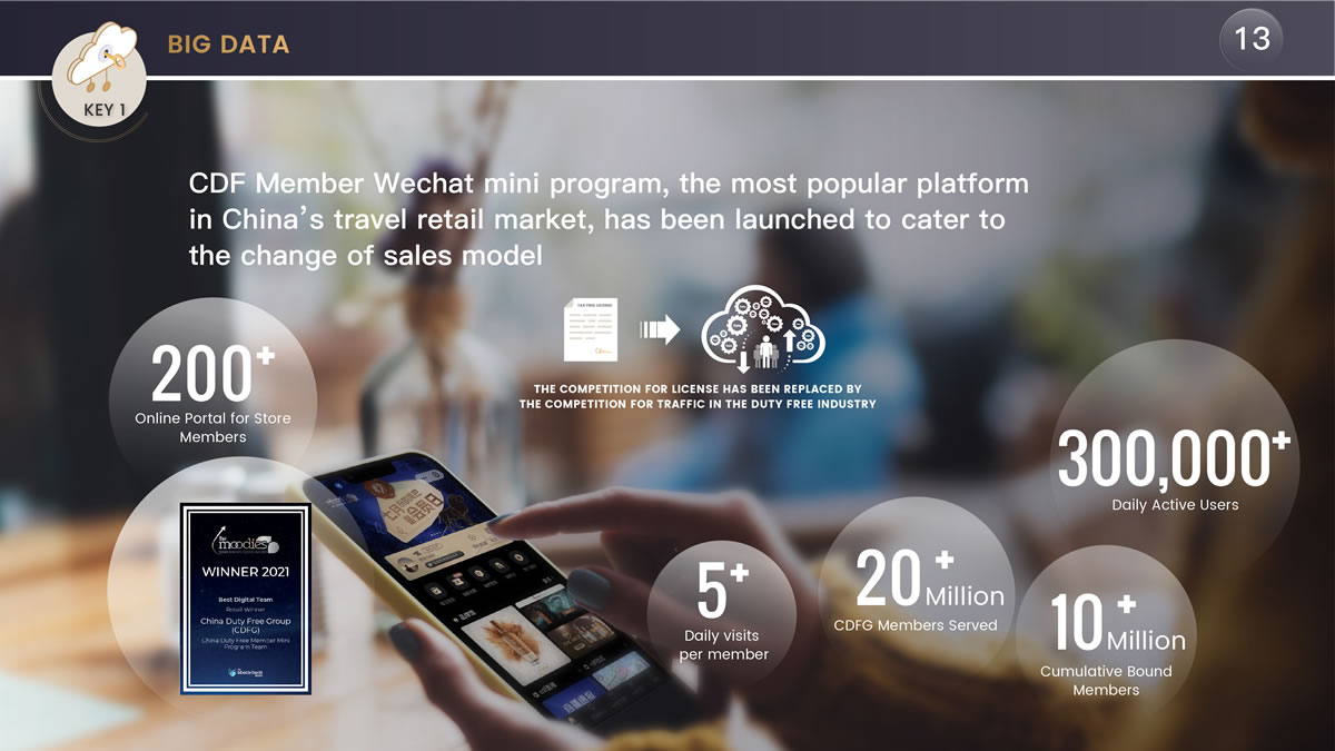 陳國(guó)強(qiáng)表示,"我們推出了基于會(huì)員的線上平臺(tái)cdf會(huì)員購(gòu),此外還積極迎合銷售模式的變化,推出了基于中免2000多萬(wàn)會(huì)員的會(huì)員小程序,在流量為王的時(shí)代建立了中國(guó)旅游零售市場(chǎng)最大的流量平臺(tái)。"他介紹稱,"通過(guò)兩年多的運(yùn)營(yíng),該會(huì)員小程序日活躍用戶達(dá)30多萬(wàn),成為中免甚至是中國(guó)旅游零售重要的流量平臺(tái),未來(lái)機(jī)場(chǎng)口岸的客流恢復(fù)后還將成為打通中免線上線下的重要流量入口。"這一舉措也得到了業(yè)內(nèi)的高度認(rèn)可,榮獲穆迪2021年度最佳數(shù)字團(tuán)隊(duì)獎(jiǎng)。