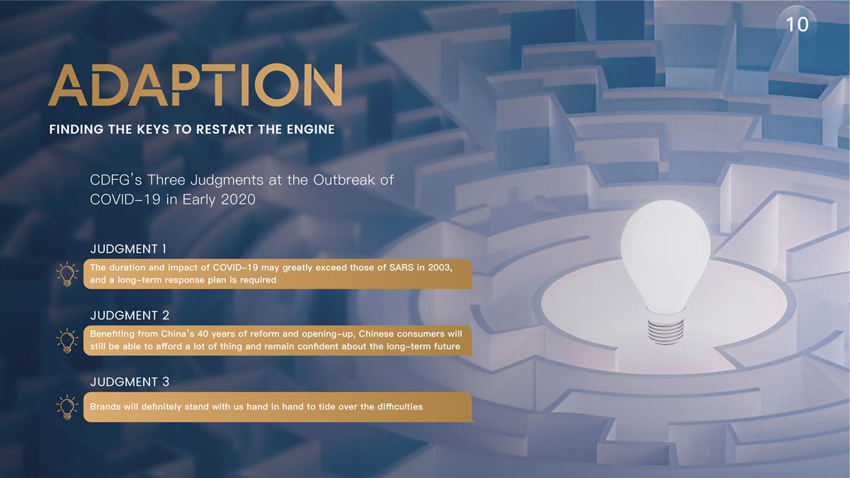 陳國(guó)強(qiáng)指出:"在三年前疫情剛剛爆發(fā)時(shí),我做出了3個(gè)判斷:一是這場(chǎng)疫情的持續(xù)時(shí)間可能會(huì)大大超過(guò)2003年的非典,我們必須做出長(zhǎng)期的應(yīng)對(duì)規(guī)劃;二是雖然疫情會(huì)帶來(lái)各方面的不利影響,但在中國(guó)40年改革開放的紅利下,消費(fèi)者仍保持著強(qiáng)勁的消費(fèi)能力并對(duì)未來(lái)長(zhǎng)期充滿信心;三是品牌方一定會(huì)和我們站在一起,共謀方略,共渡難關(guān)。"