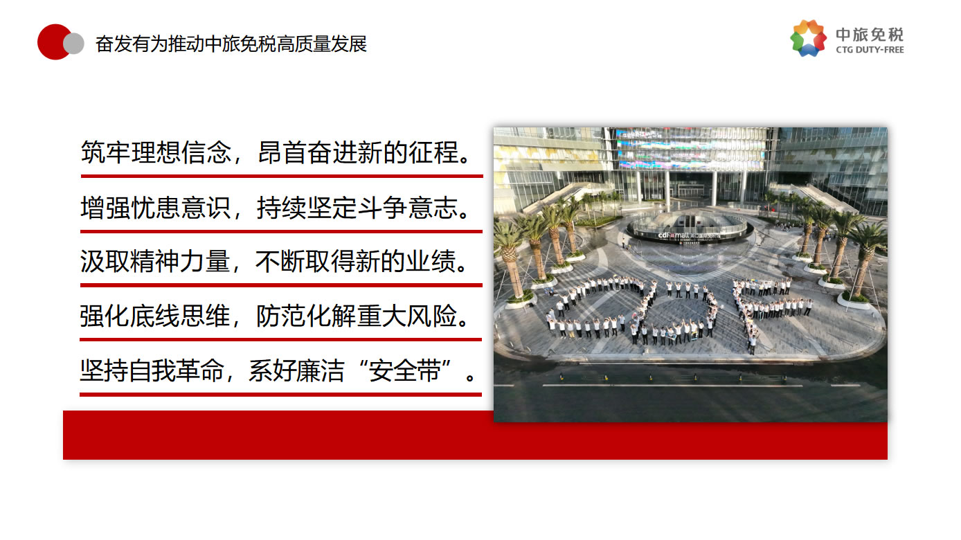 一是筑牢理想信念,昂首奮進(jìn)新的征程。要堅(jiān)決貫徹落實(shí)總書(shū)記指示,優(yōu)化發(fā)展方式,注重發(fā)展品質(zhì),追求質(zhì)量更優(yōu)、效益更好、效率更高的可持續(xù)增長(zhǎng),做強(qiáng)做優(yōu)公司核心競(jìng)爭(zhēng)優(yōu)勢(shì),全面提升公司經(jīng)營(yíng)發(fā)展的系統(tǒng)能力。二是增強(qiáng)憂患意識(shí),持續(xù)堅(jiān)定斗爭(zhēng)意志。要進(jìn)一步強(qiáng)化危機(jī)意識(shí)、憂患意識(shí),主動(dòng)擔(dān)責(zé)、主動(dòng)擔(dān)難、主動(dòng)擔(dān)險(xiǎn),以強(qiáng)烈的使命感和責(zé)任感,統(tǒng)一思想、統(tǒng)一意志、統(tǒng)一行動(dòng)。三是汲取精神力量,不斷取得新的業(yè)績(jī)。要以“紅色引擎 免稅先鋒”“海棠精神”“紅帆工程”等黨建品牌活動(dòng)為切入點(diǎn),進(jìn)一步提升基層黨組織的組織力,通過(guò)共建活動(dòng)平臺(tái)、分享工作資源、交流工作經(jīng)驗(yàn)、解決實(shí)際問(wèn)題等途徑,實(shí)現(xiàn)黨的建設(shè)與業(yè)務(wù)發(fā)展建設(shè)良性互動(dòng),以深入推進(jìn)全面從嚴(yán)治黨引領(lǐng)保障高質(zhì)量發(fā)展。四是強(qiáng)化底線思維,防范化解重大風(fēng)險(xiǎn)。要深刻領(lǐng)會(huì)習(xí)近平總書(shū)記關(guān)于強(qiáng)化底線思維,防范化解重大風(fēng)險(xiǎn)的重要論述,充分認(rèn)清當(dāng)前面臨的形勢(shì)任務(wù),系統(tǒng)梳理查找存在的突出風(fēng)險(xiǎn)問(wèn)題,自覺(jué)從習(xí)近平新時(shí)代中國(guó)特色社會(huì)主義思想中找到破解矛盾問(wèn)題的鑰匙,努力在新思想指引下探索推動(dòng)高質(zhì)量發(fā)展的路徑。五是堅(jiān)持自我革命,系好廉潔的“安全帶”。要繼續(xù)發(fā)揚(yáng)自我革命精神,縱深推進(jìn)黨風(fēng)廉政建設(shè)和反腐敗斗爭(zhēng),一體推進(jìn)“不敢腐、不能腐、不想腐”,圍繞財(cái)經(jīng)領(lǐng)域?qū)m?xiàng)整治等重點(diǎn)問(wèn)題、緊盯海南地區(qū)所屬的重點(diǎn)企業(yè)和重點(diǎn)項(xiàng)目,以及防范離島免稅“套代購(gòu)”、傳統(tǒng)渠道免稅店經(jīng)營(yíng)風(fēng)險(xiǎn)等重點(diǎn)領(lǐng)域和巡視整改等重點(diǎn)工作,深化標(biāo)本兼治、系統(tǒng)治理,以新時(shí)代廉潔文化建設(shè),涵養(yǎng)求真務(wù)實(shí)、團(tuán)結(jié)奮斗的中免風(fēng)貌。